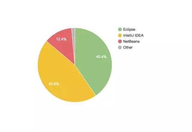 對(duì)應(yīng)的是sublime、atom……從這個(gè)角度講,VSCode無(wú)疑是最成功的,正在蠶食競(jìng)爭(zhēng)對(duì)手的市場(chǎng)。而JetBrains系列對(duì)應(yīng)的是 Visual Studio。如果按語(yǔ)言區(qū)分,Java(Android) 陣營(yíng)的 IDE 正在被 JetBrains 蠶食。從去年(2016)IntelliJ IDEA 就超越了 Eclipse,下圖是今年的份額:
