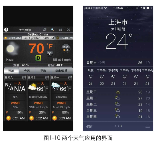 圖1-10是2個應(yīng)用的界面截圖。同樣是天氣預(yù)報的應(yīng)用,左邊的界面元素復(fù)雜,內(nèi)容雜亂,用戶很難快速獲取信息,而右邊的界面就清晰很多了。如果設(shè)計師都能長期關(guān)注設(shè)計趨勢、關(guān)注優(yōu)秀的設(shè)計是什么樣的,那左邊這樣的設(shè)計也許慢慢地就不復(fù)存在了。踩著巨人的肩膀,才能看得更遠。