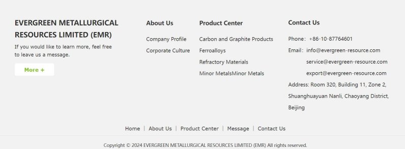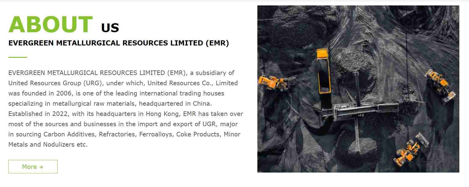 EVERGREEN METALLURGICAL RESOURCES LIMITED (EMR), a subsidiary of United Resources Group (URG), under which, United Resources Co., Limited was founded in 2006, is one of the leading international trading houses specializing in metallurgical raw materials, headquartered in China. Established in 2022, with its headquarters in Hong Kong, EMR has taken over most of the sources and businesses in the import and export of UGR, major in sourcing Carbon Additives, Refractories, Ferroalloys, Coke Products, Minor Metals and Nodulizers etc.